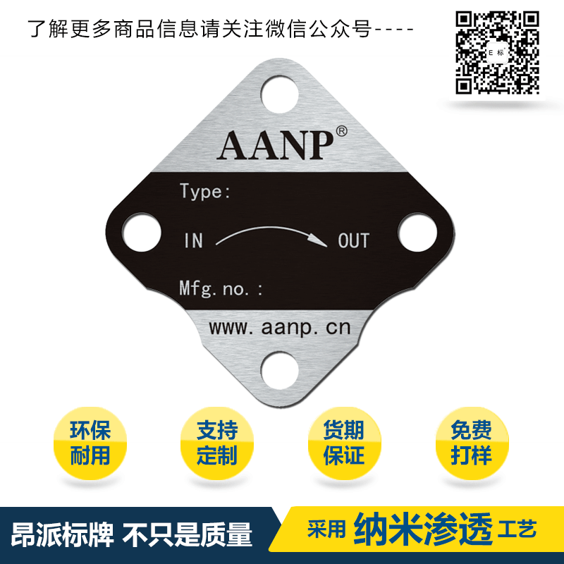 、銘牌、鋁牌的特色:特殊滲透印刷的金屬標牌,抗磨損性能較高,金屬標牌不僅擁有特殊印刷優點,同時耐酸堿、