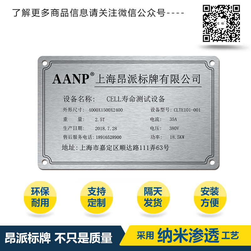 設備銘牌標牌 時間:2018-09-10 13:47:18 分類:金屬銘牌 瀏覽:次 標牌、銘牌、鋁牌的品質: 本產品具有耐酸堿、耐熱震、耐高溫、抗沖擊、還具有很強的耐曬、耐磨擦、耐高溫、耐腐蝕、耐有機溶劑等特性,抗紫外線、抗粉化、不受臭氧、空氣污染、在室外陽光照射不易褪色,廣泛應用于化工、電力和電信等腐蝕性強或須把標志牌懸掛于室外的企業,歡迎新老客戶拿圖拿樣來定做.不分量大小都可以定做價格合理.質量保證交貨準時。 分享收藏: 上一個: 英文銘牌標牌 下一個: 箭頭銘牌標牌 相關產品 特種設備陽極氧化鋁銘牌標牌 陽極氧化指示小銘牌標牌 自動化設備鋁銘牌標牌 設備信息陽極氧化銘牌標牌 汽車零配件鋁銘牌標牌 產線標識鋁銘牌標牌